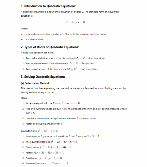 The chapter “Quadratic Equations” in Class 10 Science explores the fundamental properties, reactivity, and applications of Quadratic Equations. Below is a detailed explanation of the key topics covered in this chapter based on class 10 maths syllabus: